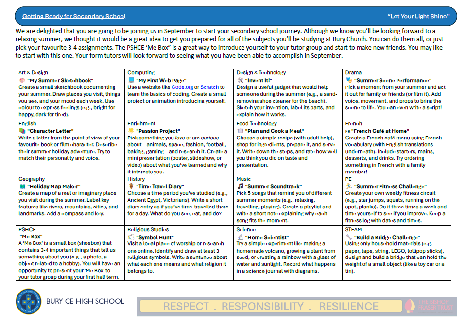 We challenge our Year 6 students to read a Wrinkle in Time over the summer before starting at Bury Church and to apply for their Blue Peter Reading Badge using the below link. Students can wear their badge on their blazer and will be invited to a rewards event with the Headteacher where we will share and celebrate this achievement.